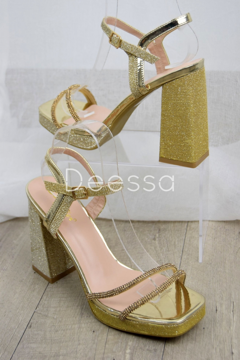 Preciosa sandalia dorada con doble tira de brillos al tono. Su tacón cuadrado de 12 cm y su plataforma de 2 cm harán que puedas darlo todo durante horas.